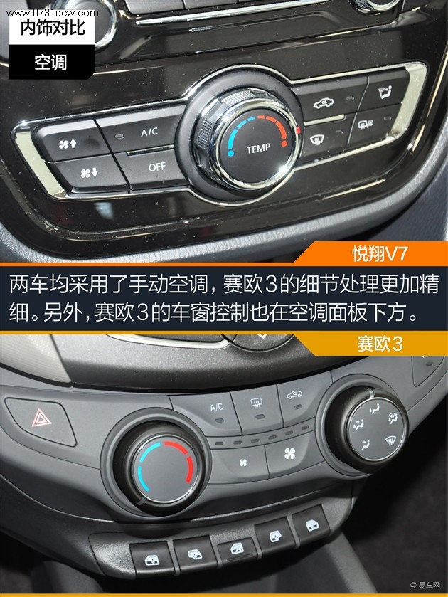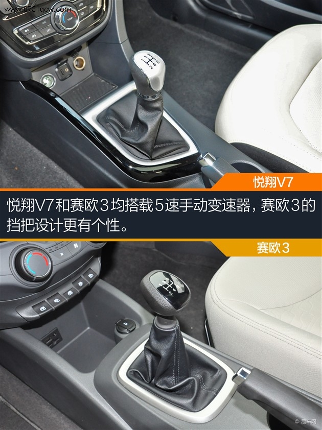 悦翔V7和赛欧3分别采用了深、浅两种风格的内饰,两车的中控面板均采用硬质塑料覆盖。悦翔V7大面积采用了烤漆面板,但视觉效果并不如赛欧3来得清爽和精细。