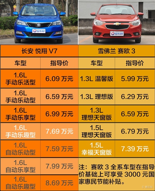 赛欧3目前只推出了手动挡车型,售价和悦翔V7手动挡非常接近。我们最终选取动力更为接近、更能体现配置水平的悦翔V7 1.6L手动乐趣型(售价7.69万元)和赛欧3 1.5L幸福天窗版(售价7.39万元)进行对比,在享受补贴后,赛欧3要比悦翔V7便宜6000元。(为便于描述,下文以悦翔V7和赛欧3分别代表参与对比的配置车型)
