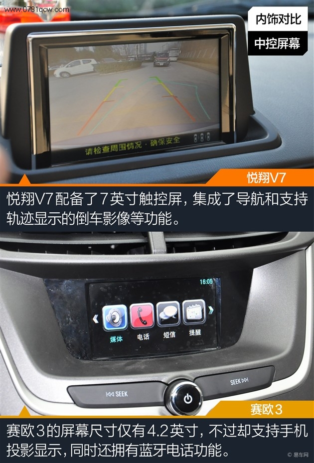赛欧3的4.2寸显示屏在悦翔面前显得比较寒酸,除了不支持导航和倒车影像外,赛欧3多出了蓝牙和手机投射显示功能。但这块4.2寸屏幕和这些功能仅在赛欧3的顶配车型出现。