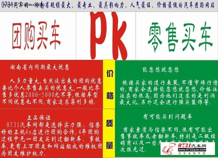 (1)专业服务:0731汽车网所有团长均由资深专业人士担当(大多数团长都是由原来自己买车组团而来),团购合作对象的选择非常注重其信誉、口碑及服务。必须进行“企业资质审查、服务协议审查、服务承诺审查”,而且整个服务过程中网站要全程监控。