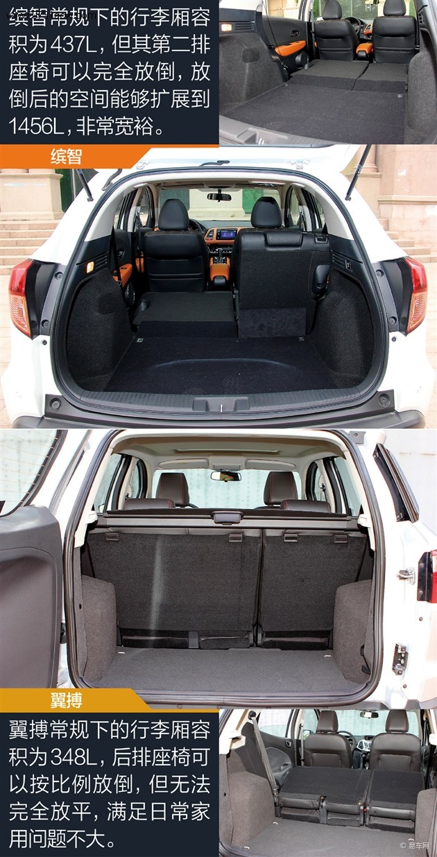 从车身尺寸来看,缤智的长度和轴距要优于翼搏,而真正的乘坐体验上,缤智的后排乘坐空间也确实更加理想。虽然车长只有14mm的差距,但翼搏因采用了后挂式备胎设计,因此真正的内部空间并不如缤智那般从容。此外,缤智得益于其魔术座椅的发挥,使得其在空间灵活性方面优势明显,第二排座椅可以竖立及完全放平的设计也是翼搏难以企及的绝对优势。