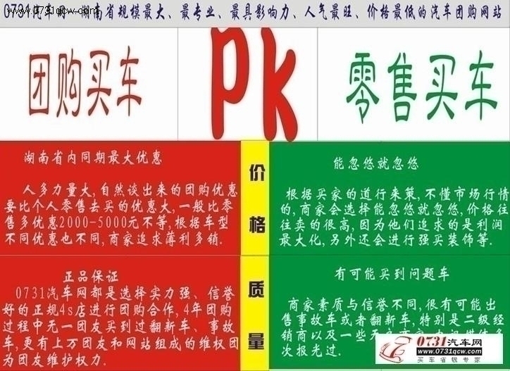 (1)专业服务:0731汽车网所有团长均由资深专业人士担当(大多数团长都是由原来自己买车组团而来),团购合作对象的选择非常注重其信誉、口碑及服务。必须进行“企业资质审查、服务协议审查、服务承诺审查”,而且整个服务过程中网站要全程监控。