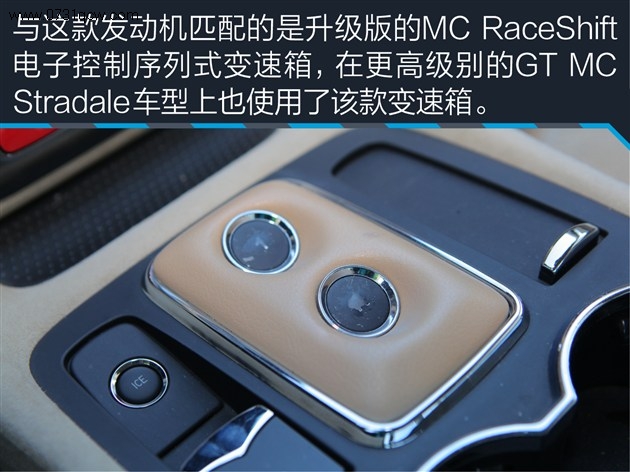 与这款发动机匹配的是升级版的MC RaceShift电子控制顺序变速箱。该车拥有AUTO(自动)和SPORT(运动)两不同种驾驶模式,这些模式可不是仅仅延迟换挡时间(提高换挡转速)那么简单。按住AUTO键可以切换成MC-R手动模式,也就是纯“赛车”模式,换挡时间可缩短至100毫秒。