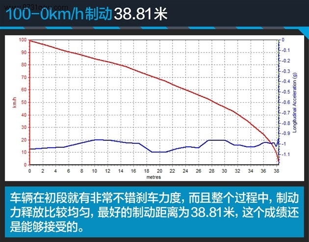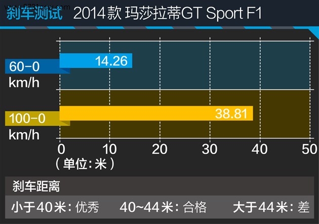 玛莎拉蒂GT Sport F1的制动测试成绩还是很令人满意的,虽然有不良车况所限,但出色的悬架支撑性保持了良好的车身姿态,这有助于缩短制动距离。配备的Brembo制动系统也能给人很充足的信心,只要轻点刹车踏板,就能感觉到车速明显下降,制动系统在全程提供了-1g的制动水平,最终制动成绩为38.72米。