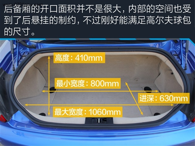 储物空间方面,这款车的后备厢容积仅为260升,从数据上看其容积非常小,甚至还比一些两厢小型车的后备厢还要小。不过经过我们的实际测量,尽管后备厢纵深和高度仅为630mm和410mm,但是最大宽度能达到1060mm,塞一些简单的行李一般不会有问题,不过我认为这样的设计主要是为了容纳高尔夫球包。客舱内的储物空间数量并不少,分布也比较分散,使用起来还算顺手。