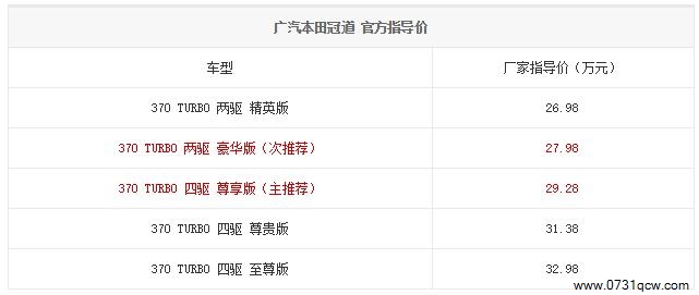 冠道的厂家指导价为26.98万-32.98万元,新车前期推出搭载2.0T涡轮增压发动机的5款370 TURBO车型,搭载1.5T涡轮增压发动机的240 TURBO车型将会在2017年3月上市,预售价22万元起。经过比较,售价27.98万元的370 TURBO 两驱 豪华版以及售价29.28万元的370 TURBO 四驱 尊享版是在售的2.0T车型中更具性价比的车型,他们配置更为丰富,安全配置全面,值得购买。而对预算有限的各位来说,将于2017年3月上市的搭载1.5T发动机的240 TURBO车型更加实惠,不推荐配置过低的370 TURBO 两驱 精英型。