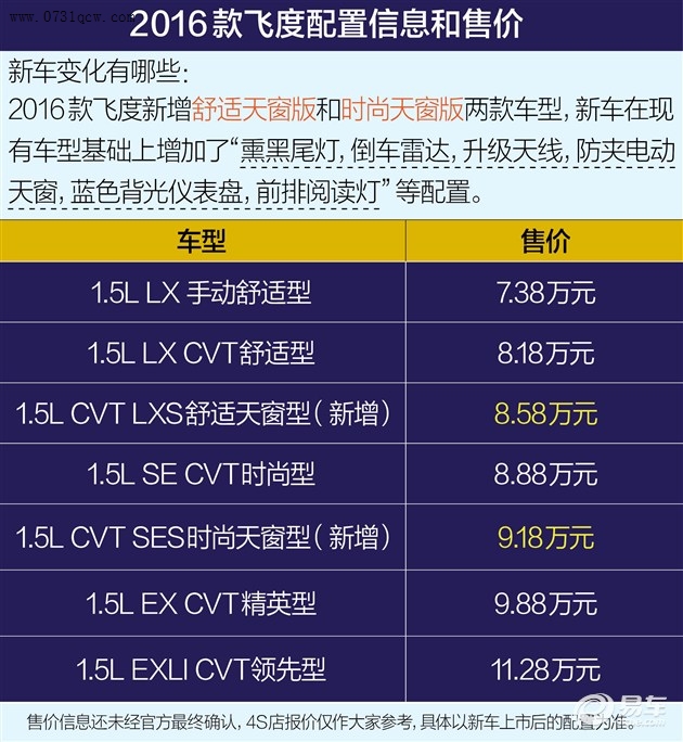 时隔两年,第三代飞度终于迎来了它的年度改款:新增两款车型且配置升级。编辑也是新飞度(精英版)的车主,我还以为广本会发挥洪荒之力要在冠道上市之前把GK5也整成最新的本田家族式脸谱(雅阁、十代思域和冠道都采用了本田最新前脸)呢。结果今天在4S店了解到真车和售价,觉得飞度这次年度小改款的力度非常小,详细信息请看下表:
