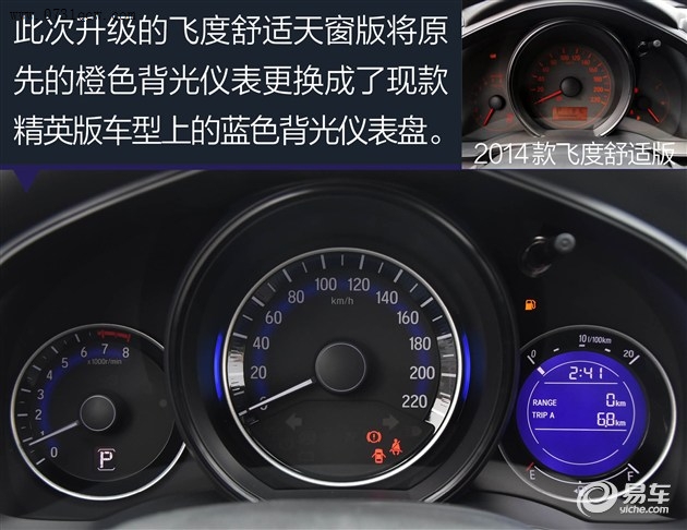 编辑实拍的是2016款飞度舒适天窗版,它舍弃了现款舒适版的橙色仪表,采用了精英版车上的蓝色背光仪表。我个人觉得蓝色背光更醒目,而且时速表的背光会根据油门深浅改变颜色(绿色-浅蓝色-深蓝色)以提醒当下驾驶时否节能。另外,在新飞度顶配车型仪表上还有车外温度显示,要是能标配的话就更好了。