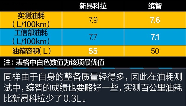 在油耗测试环节,体重更轻的缤智也领先于新昂科拉,经过接近120km的油耗测试里程后,它的实测油耗成绩是7.6L/100km,而新昂科拉的实测油耗成绩是7.9L/100km,不过二者的差距只有0.3L/100km,因此两车也基本处于相同的水平线上。顺便值得一提的是,由于二者都有发动机启停系统,这项配置在拥堵道路中也能为大家节省不少汽油消耗。