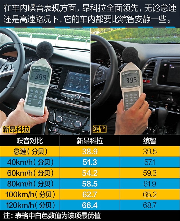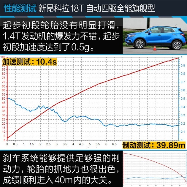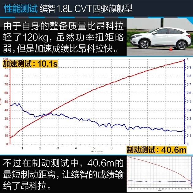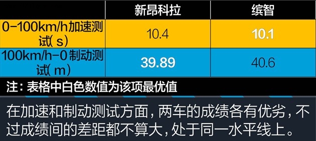 在0-100km/h加速测试环节,缤智的成绩是10.1s,比新昂科拉10.4s的成绩要略快一些,由于前者的整备质量比新昂科拉轻了120kg,因此在加速测试中的成绩更快。在100km/h-0制动测试中,新昂科拉则凭借着39.89m的最短制动距离战胜了缤智。