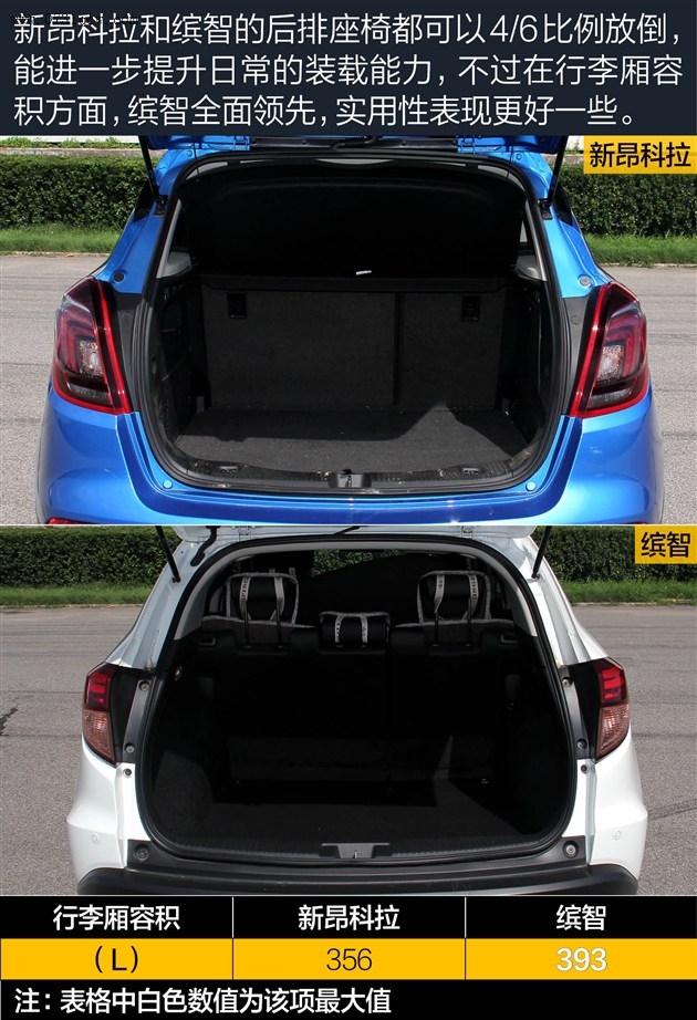 在行李厢空间方面,昂科拉和缤智的表现都很不错,二者的后排座椅都能等比例放倒,可以在日常使用中拓展出更大的空间来装载物品,在行李厢参数上,缤智的表现要略好一些,393L的容积比356L的昂科拉更大一些。
