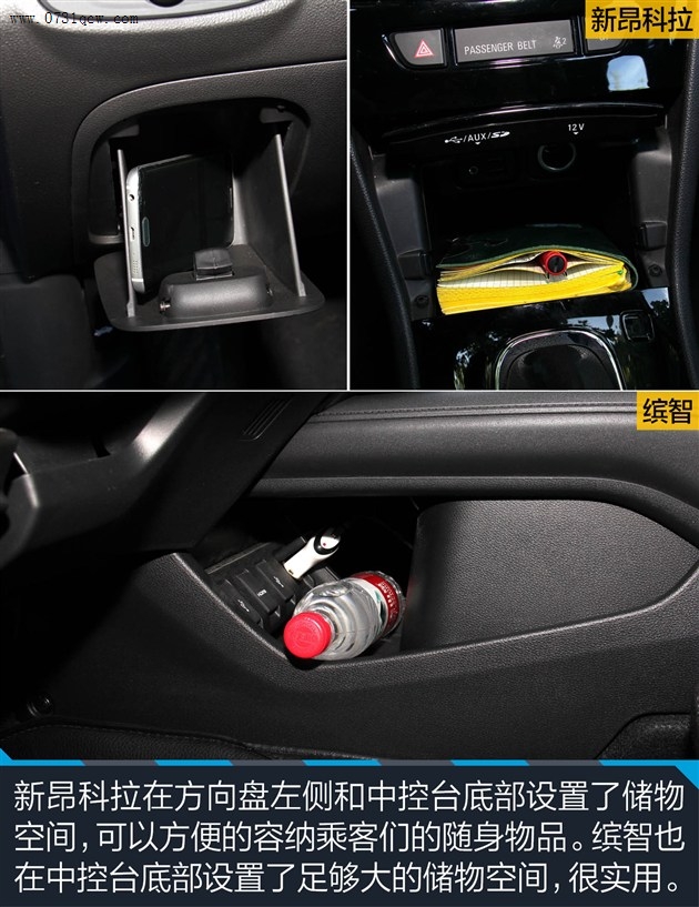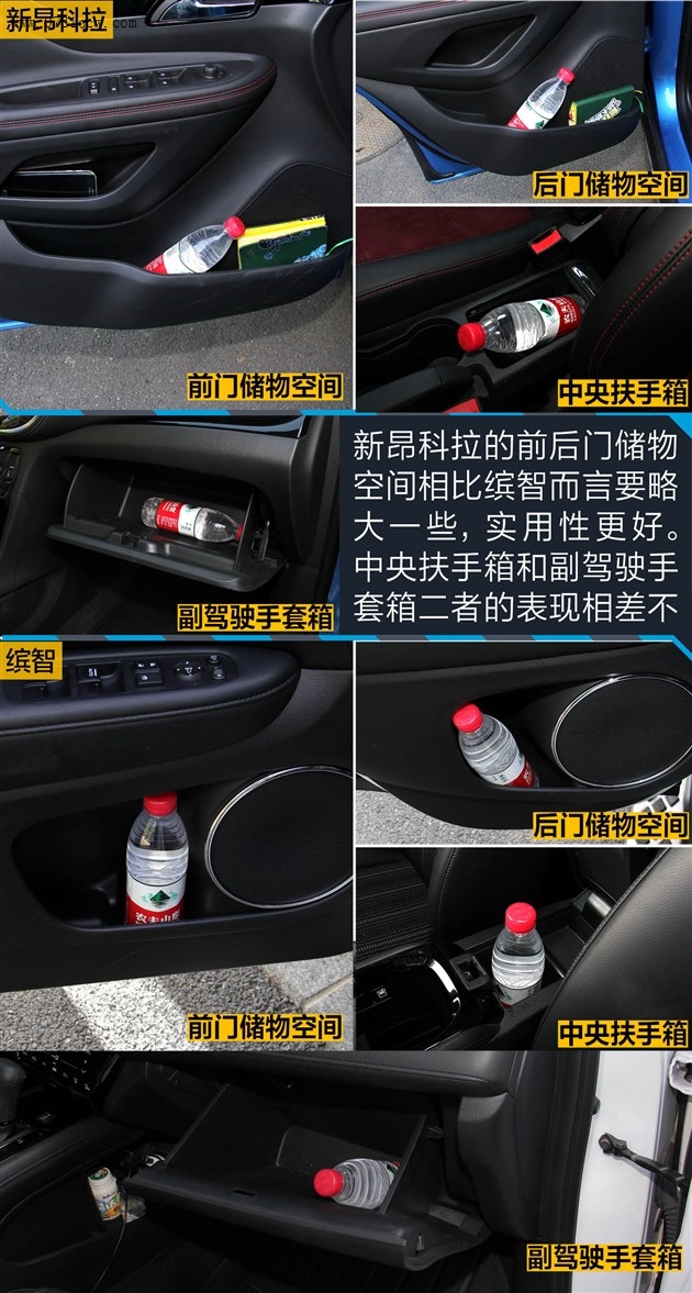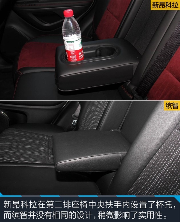 新昂科拉和缤智都在车内设置了足够多的储物空间,不过对比来看,新昂科拉的整体表现要略好一些,它的前后门储物空间无论开口和深度都比缤智更大,能容纳更多物品,同时新昂科拉还在后排中央扶手内设置了实用性更好的杯托,这也是缤智所没有的。