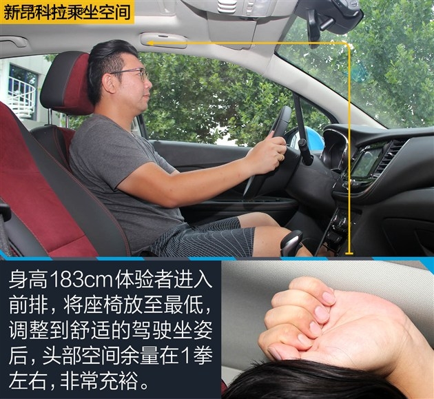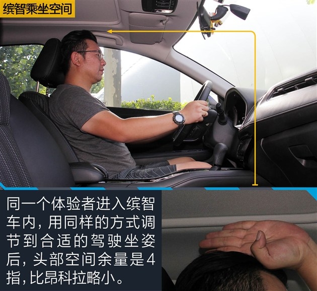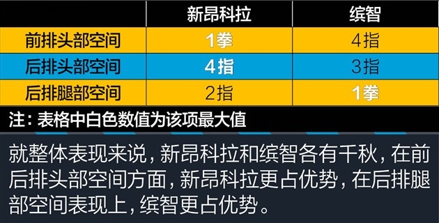 新昂科拉的前排乘坐空间比缤智表现略好,同样调节到合适的驾驶坐姿,新昂科拉的头部空间是1拳。缤智的后排腿部空间达到了1拳,对于小型SUV来说,这样的表现已经足够充裕了。