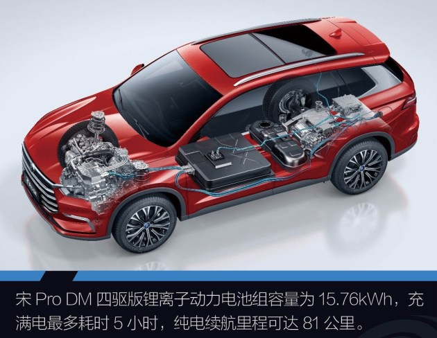 比亚迪官方宣称,宋Pro DM双擎四驱版本百公里加速6.5秒,纯电续航里程达81公里,综合续航里程近800公里。