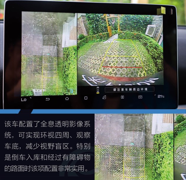 在车内也可看到车底下的画面,这对于停车入库或者经过有较多障碍物的路面时非常实用。